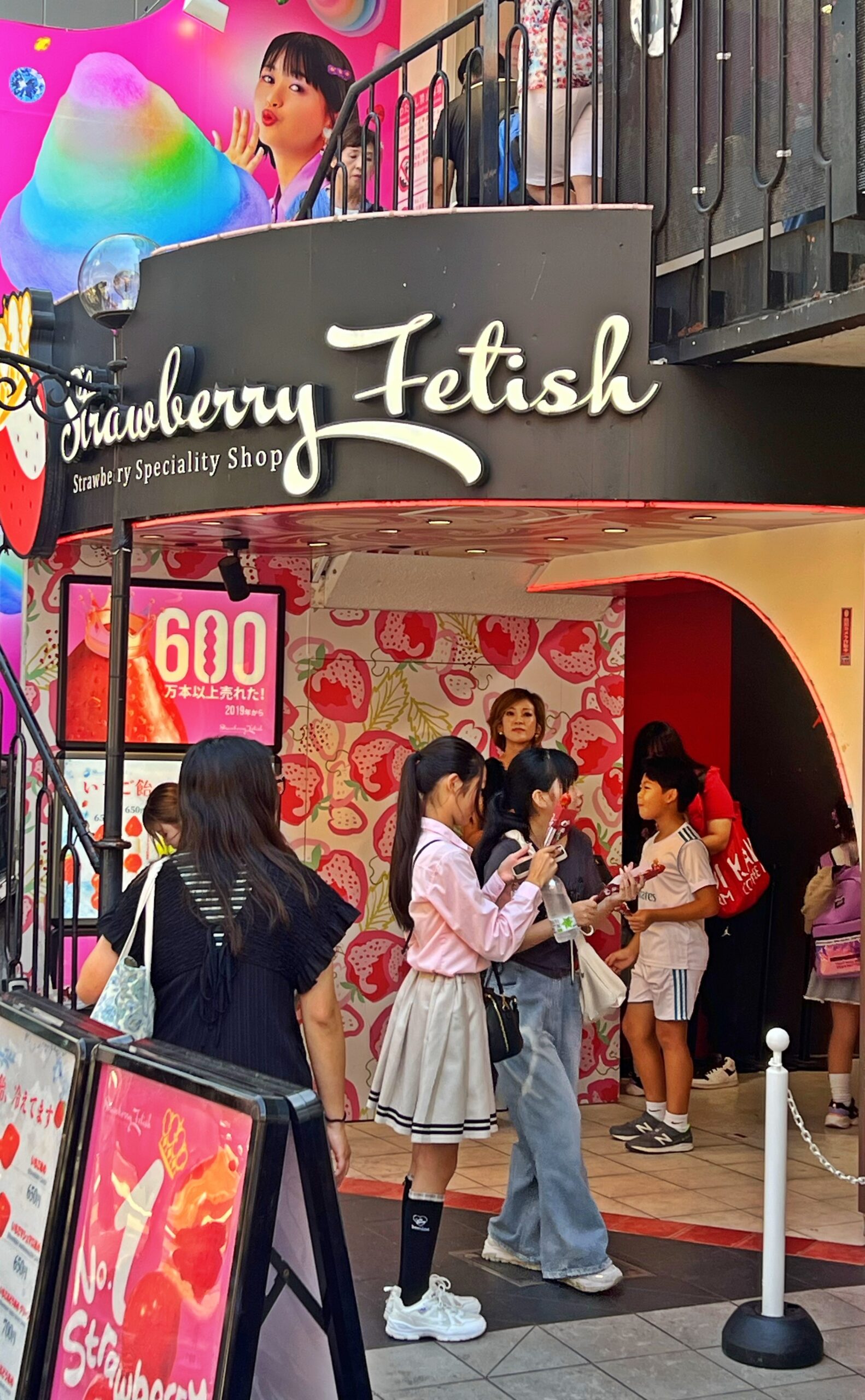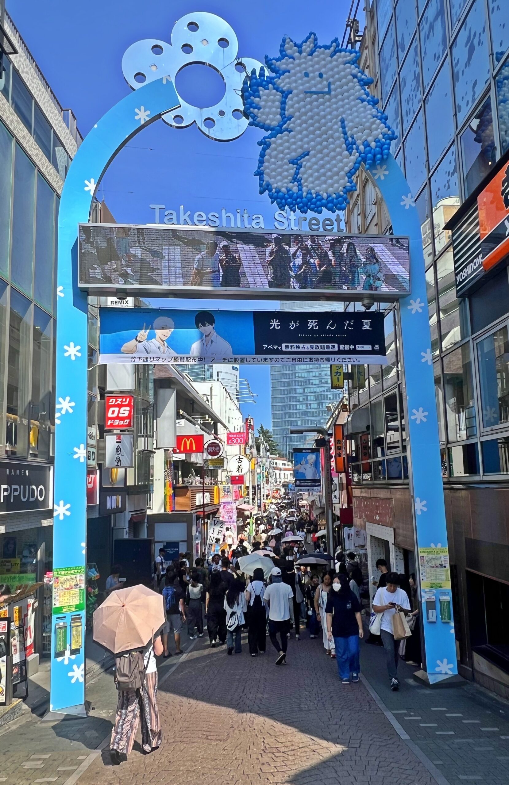 Schon am Eingangstor der Takeshita-dōri wuselt es. Schüler*innen in Uniformen, Touristen mit Kameras, Influencer, die sich in Pose werfen. Es riecht nach Zucker, Parfum und frischen Waffeln – eine Mischung, die so seltsam ist, dass sie fast schon wieder gut riecht.