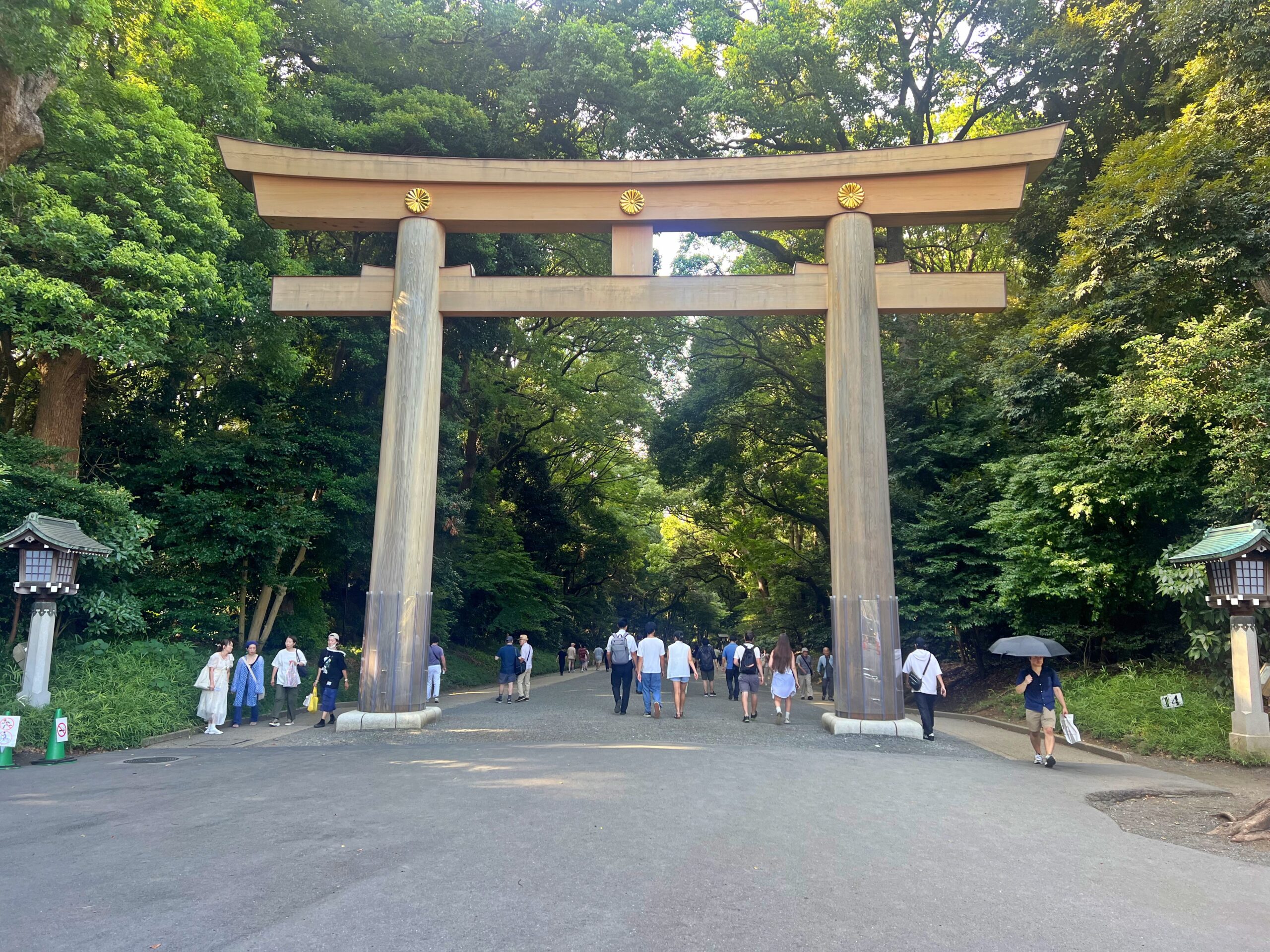 Wir betreten den riesigen Torii, dieses hölzerne Tor, das den Eingang markiert, und haben sofort das Gefühl, woanders zu sein. Der Schrein ist dem Kaiser Meiji gewidmet und gilt als einer der wichtigsten Orte der Stadt. Rundherum liegt ein stiller Park, so groß, dass man für einen Moment vergisst, in einer Metropole mit über 37 Millionen Menschen zu stehen. Die Luft riecht nach Holz und Erde, das Sonnenlicht fällt gefiltert durch das Blätterdach. Sofort spürten wir dass die großen Bäume uns ein wenig Kühlung schenkten. Bei vierzig Grad in der Mittagszeit ein willkommener Moment.