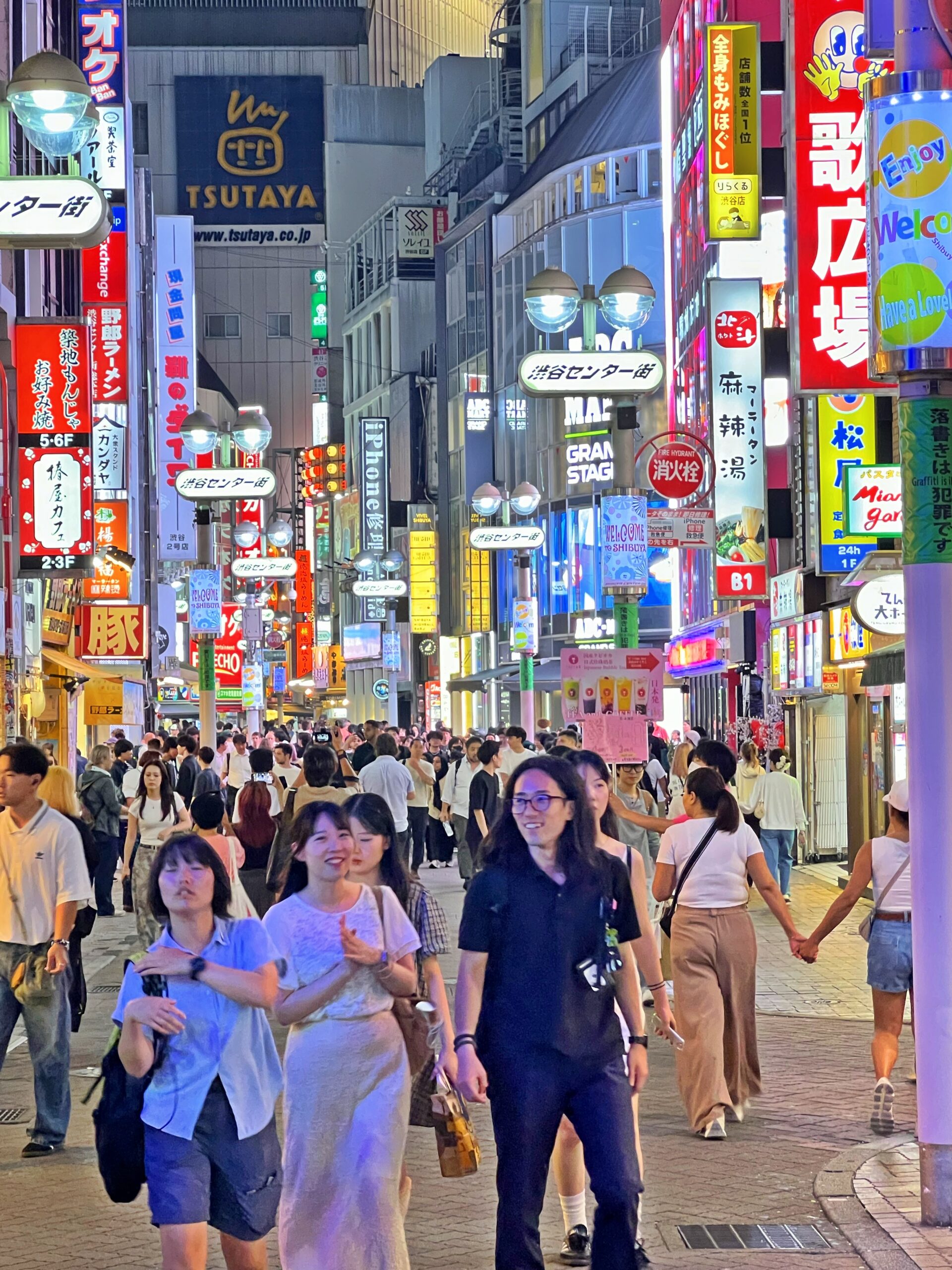 Schon der Bahnhof Shinjuku ist ein Erlebnis für sich – so groß, dass man sich leicht zehnmal verirrt. Von dort führt uns die Yasukuni-dōri direkt hinein ins Lichtermeer. Überall blinken Schilder, Musik dröhnt aus den Spielhallen, und die Luft riecht nach gegrilltem Fleisch, Parfum und Regen. Hier pulsiert das moderne Tokio.