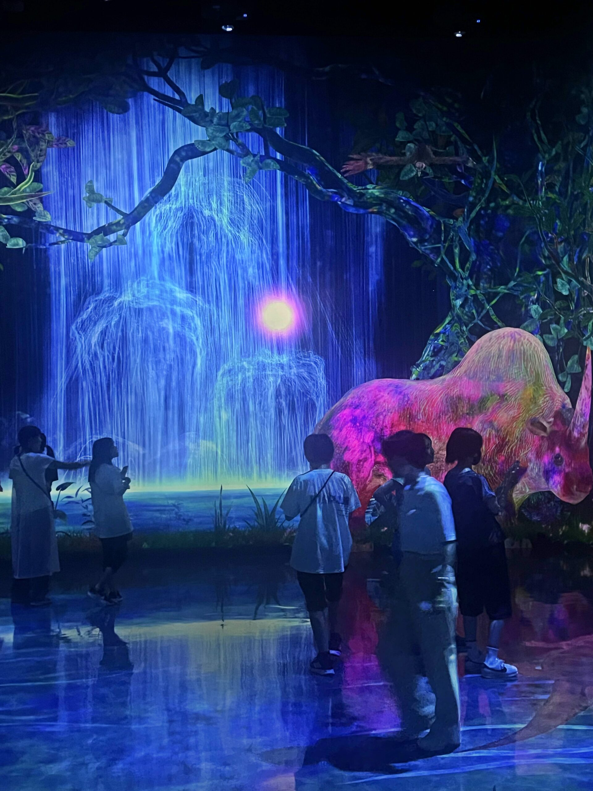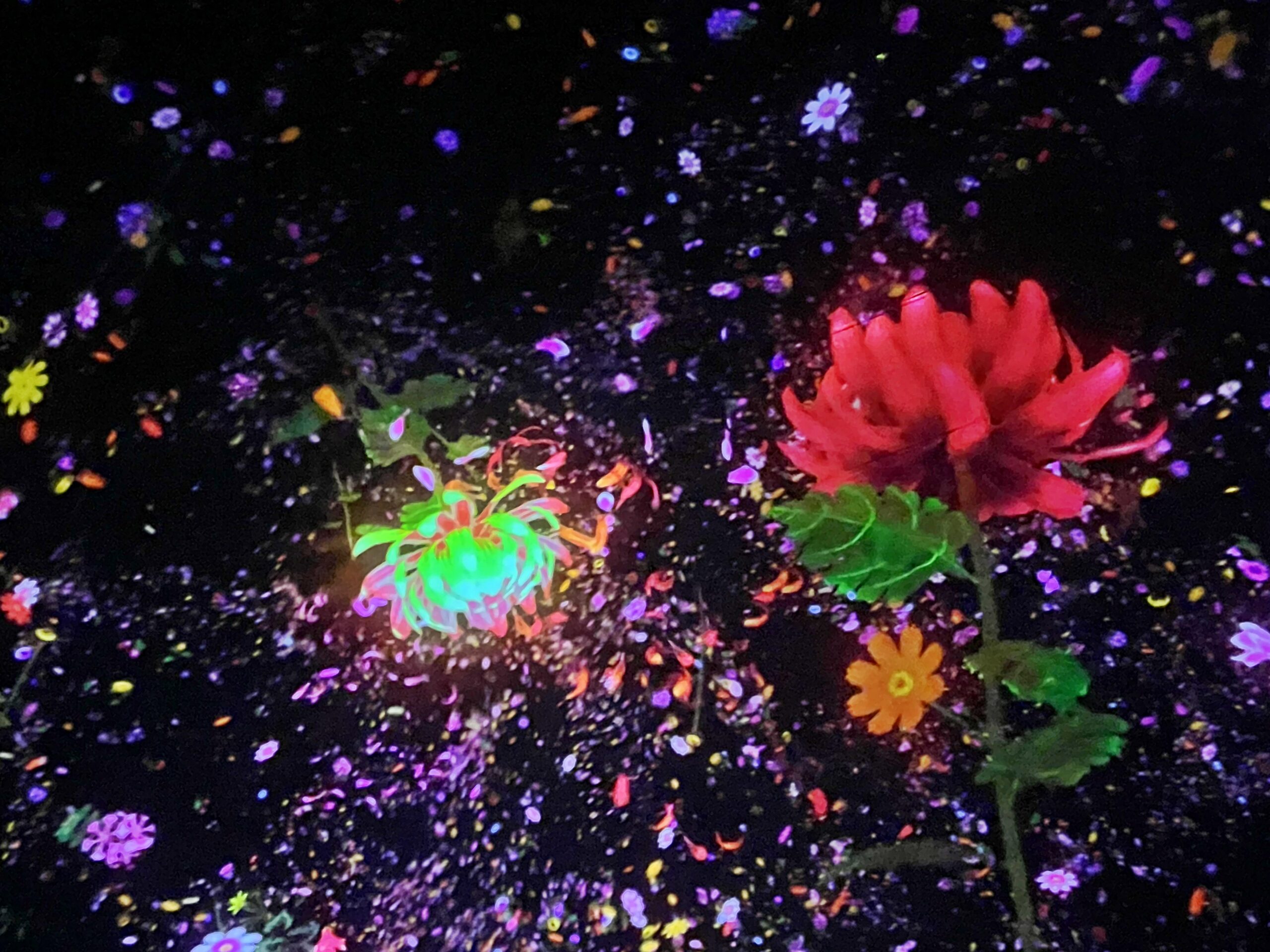 Dann die Blumeninstallation – ein Raum, in dem digitale Blüten um uns herum aufblühen, welken und verschwinden. Alles bewegt sich, alles lebt. Und obwohl nichts „echt“ ist, fühlt sich alles unglaublich echt an.