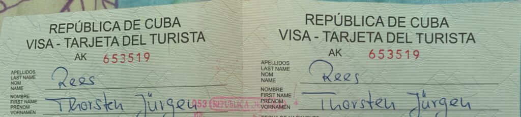 Die Touristenkarte muss auf der Rückseite einen Stempel des Reisebüros besitzen. Falls dieser fehlen sollte, wird sie eventuell nicht akzeptiert und man muss beim kubanischen Zoll eine neue kaufen. Bei der Einreise wird die Touristenkarte mit einem Stempel registriert, daher erhält man keinen separaten Stempel in den Reisepass.
