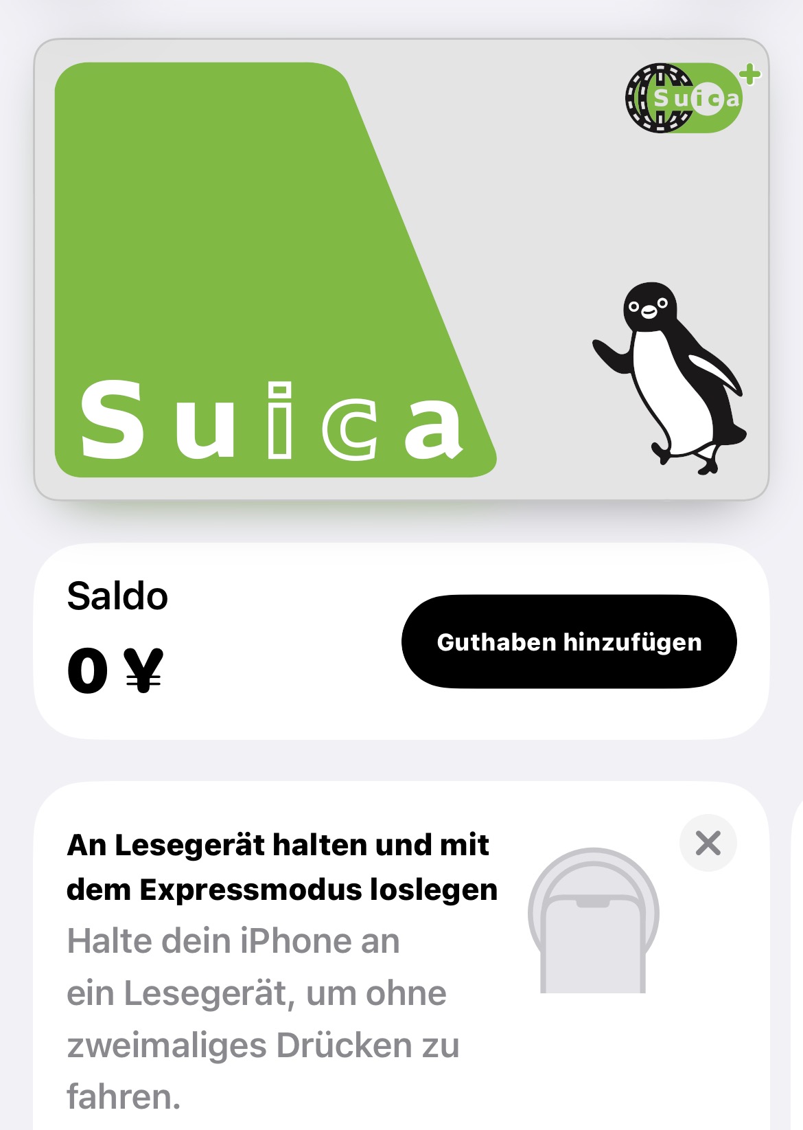 Besonders praktisch für iPhone-Nutzer:innen: Du musst keine Plastikkarte kaufen. In der Apple Wallet kannst du Suica direkt als „Transit Card“ hinzufügen, Guthaben über Apple Pay aufladen und dein Smartphone beim Ein- und Auschecken an die Lesegeräte halten. So hast du alles digital dabei und sparst Zeit am Automaten.